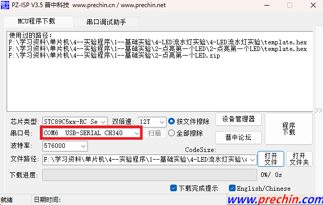 CH340驱动安装 文章索引1.连接USB线2.安装3.下载程序 1.连接USB线 使用USB线连接电脑和开发板,并打开开发板。 2.安装 双击SETUP.EXE安装 安装成功显示 3.下载程序 烧录软件 根据板载芯片型号是否含有 RC 来选择芯片类型,比如板载芯片使用 STC89C52RC 或 STC89C52RD+或 STC89C516RC 或 STC89C516RD+,则选择芯片类型 为“STC89C52xxx-RC”。如果使用 STC89C52,则芯片类型为“STC89C52xx”。 效果