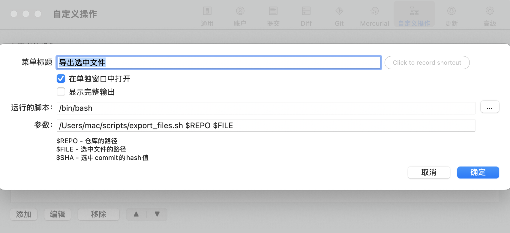 以下是在 Mac SourceTree 中设置“导出选中文件”自定义操作的步骤: